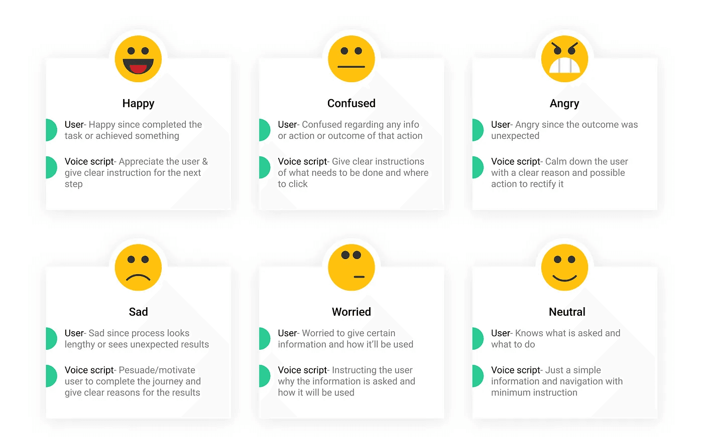 The user goes through multiple emotions in a journey. And the assistant should be able to communicate basis the emotion user is having at that moment. So I defined six emotions that the user might have and the voice script will be written according to that situation